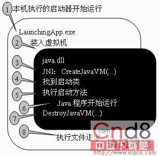 Java程序可以由任何本机运行的程序调用执行。所谓Java启动器,就是一个专门用来启动Java程序的本机执行程序。最常见的启动器是Sun在Java Runtime Environment的/bin目录中提供的启动器,就Windows平台而言,它们是java.exe和javaw.exe。前者运行时打开两个窗口:一个是接收System.out/err和启动器输出的控制台窗口,另一个是Java程序本身的窗口;javaw运行时不打开控制台窗口。在J2SE/EE平台中,虚拟机以动态库的形式实现,也放在/bin目录下。动态库的名字在Windows中是java.dll,在Unix中是java.so。所谓“装入虚拟机”,就是指装入这个动态库。