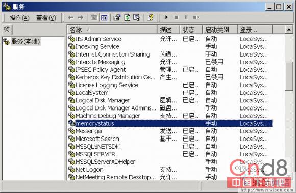 从服务控制面板启动 MemoryStatus 服务。假如初始化不出错,表示启动成功。过一会儿将服务停止。检查一下 C:MyServices 文件夹中 memstatus.txt 文件的服务输出。在我的机器上输出是这样的: