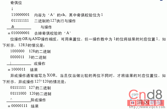 字节的位8是奇偶位,将该字节与一个位1到位7为1、位8为0的字节进行与操作,可将该字节的奇偶校验位置成0。表达式ch&127正是将ch中每一位同127数字的对应位进行与操作,结果ch的位8被置成了0。在下面的例子中,假定ch接收到字符"A"并且奇偶位已经被置位。